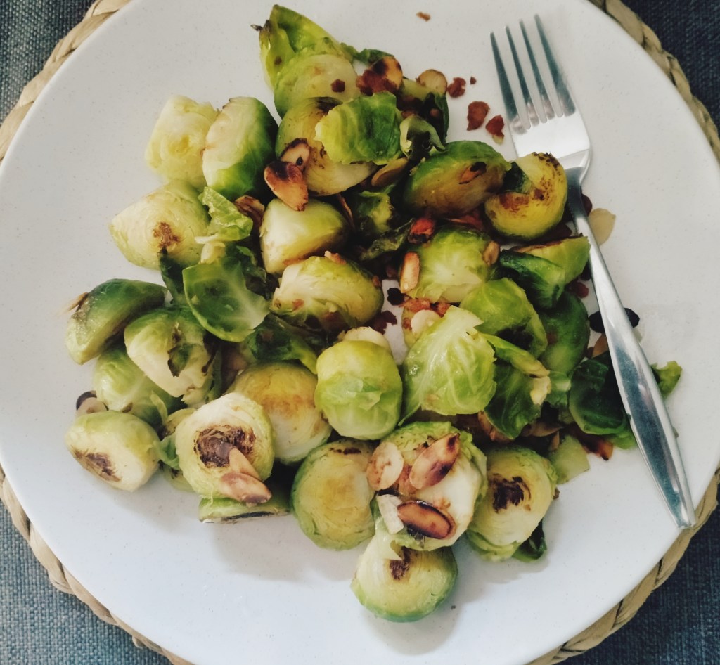 2.) Heat the oil in a large non-stick frying pan, over high heat. Add the Brussels sprouts, almonds and garlic and sauté for 4 minutes or until the Brussels are golden in parts.