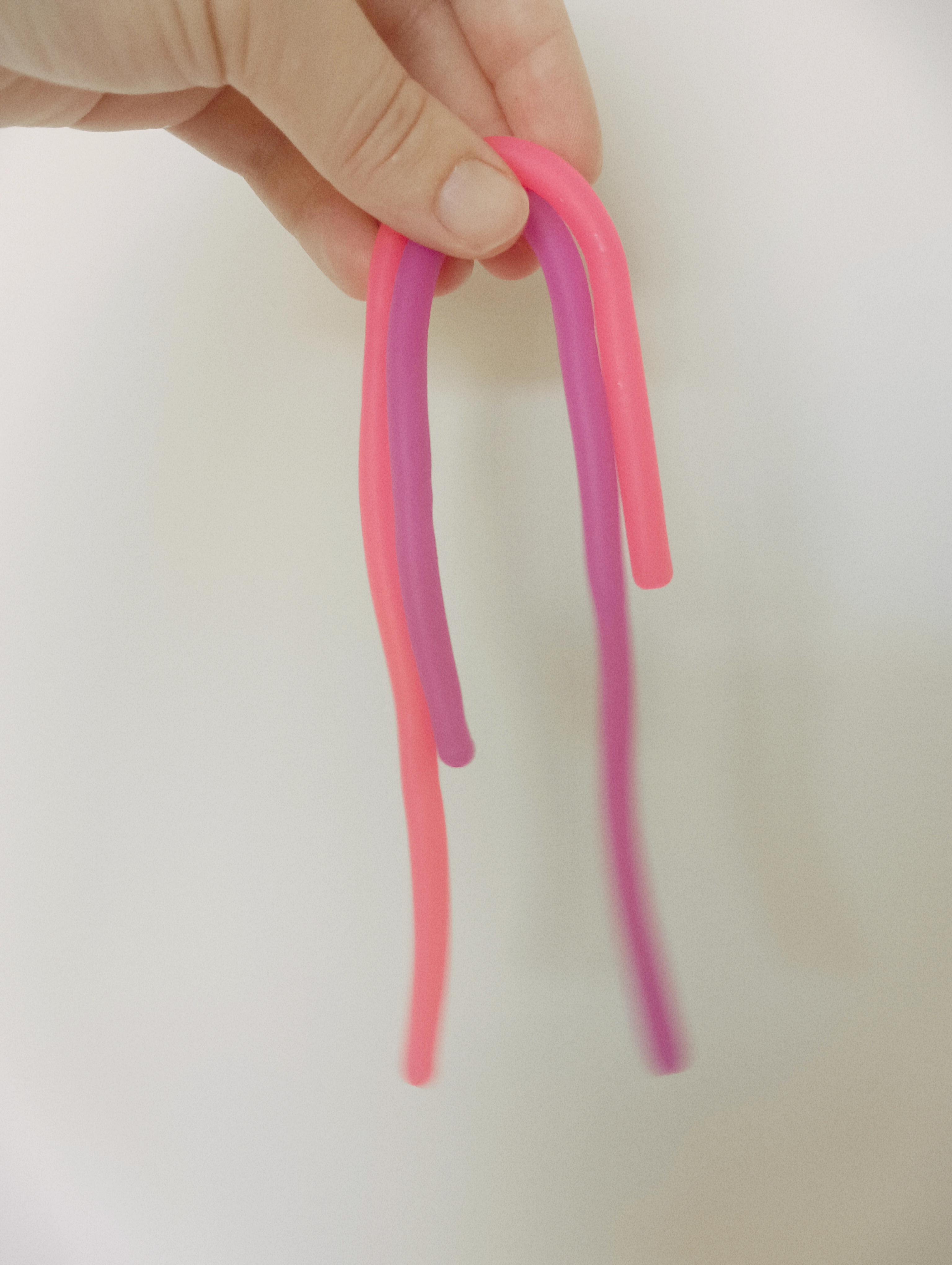 Day 12 were a pair of purple and pink squishy noodles. Believe it or not, it was quite difficult to get a photo of them. I apologise for the blurriness. They stretch quite far.