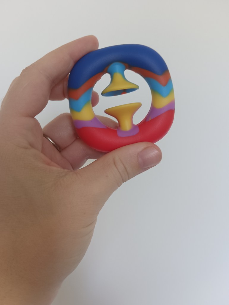 Day 9 was a strange, yet fun fidget toy. You place your fingers on the rubber grips, moving the circles around and through each other. I am a big fan of this one.