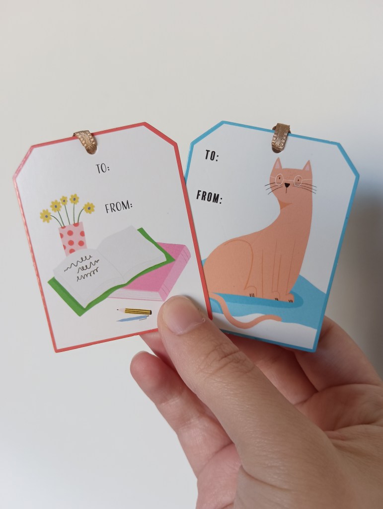 My prize for completing the prompt were these adorable gift tags. One has a pile of books and the other, a cat with glasses. I am definitely going to use them.