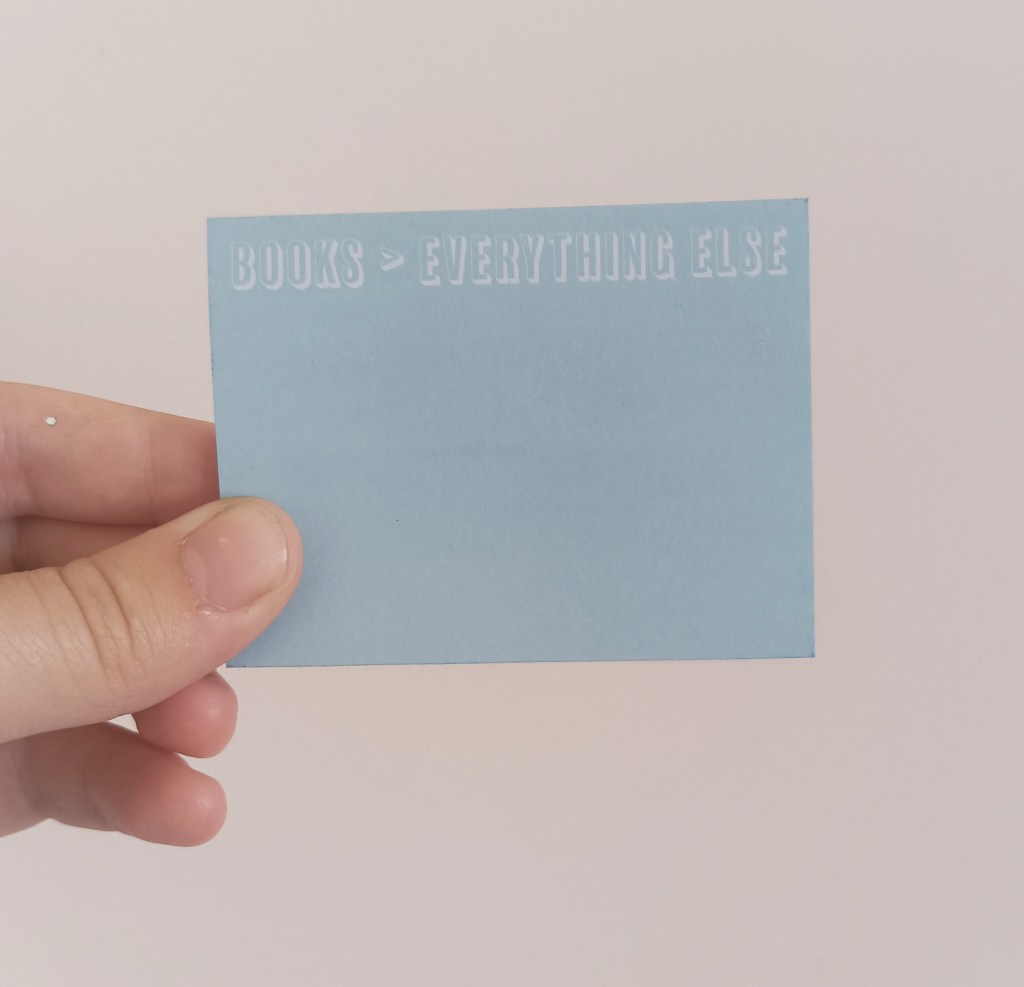 My prize for completing the prompt was a pack of blue sticky notes that read: ‘Books > Everything Else.’ They will undoubtedly come in handy!