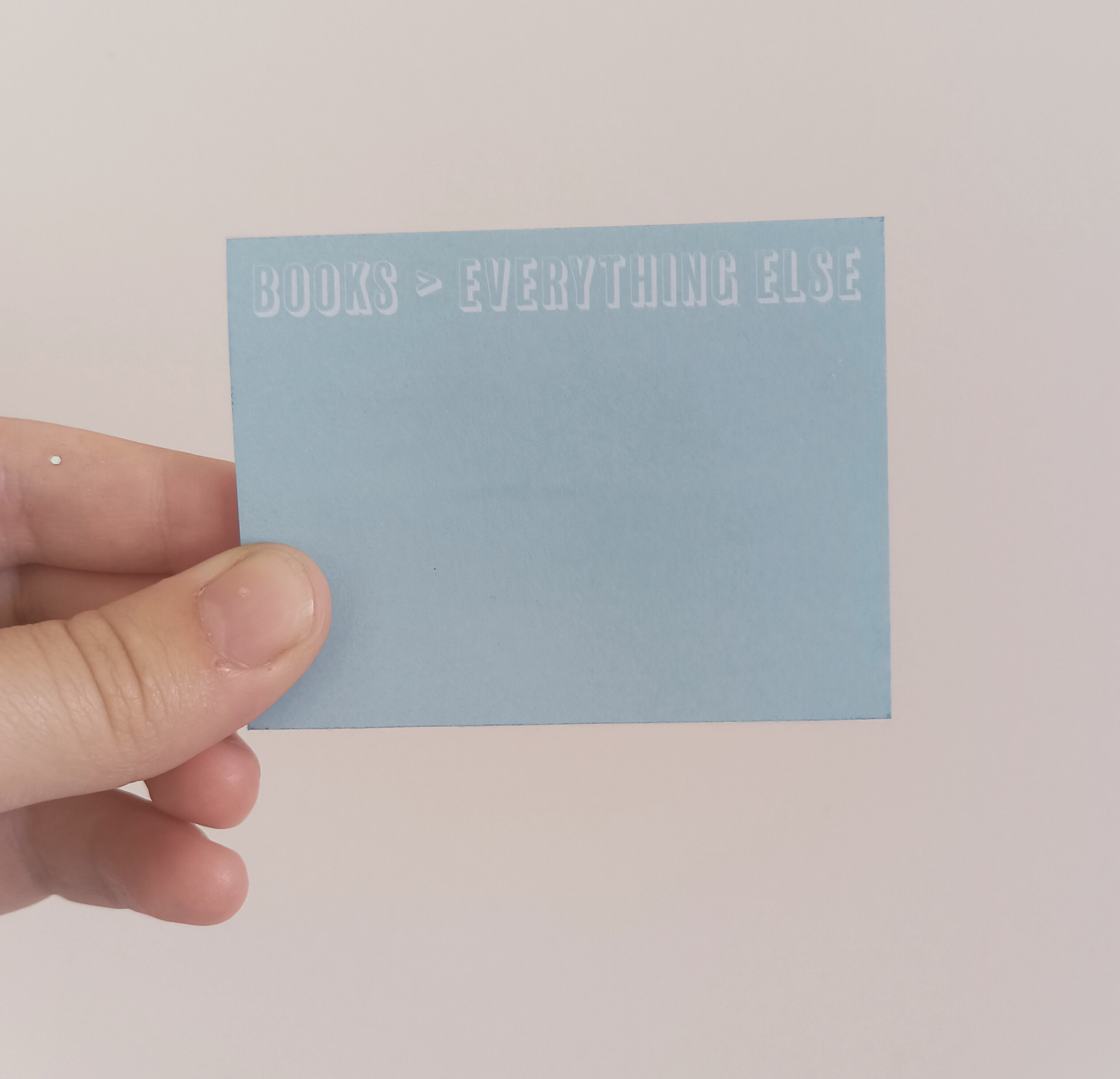 My prize for completing the prompt was a pack of blue sticky notes that read: ‘Books > Everything Else.’ They will undoubtedly come in handy!
