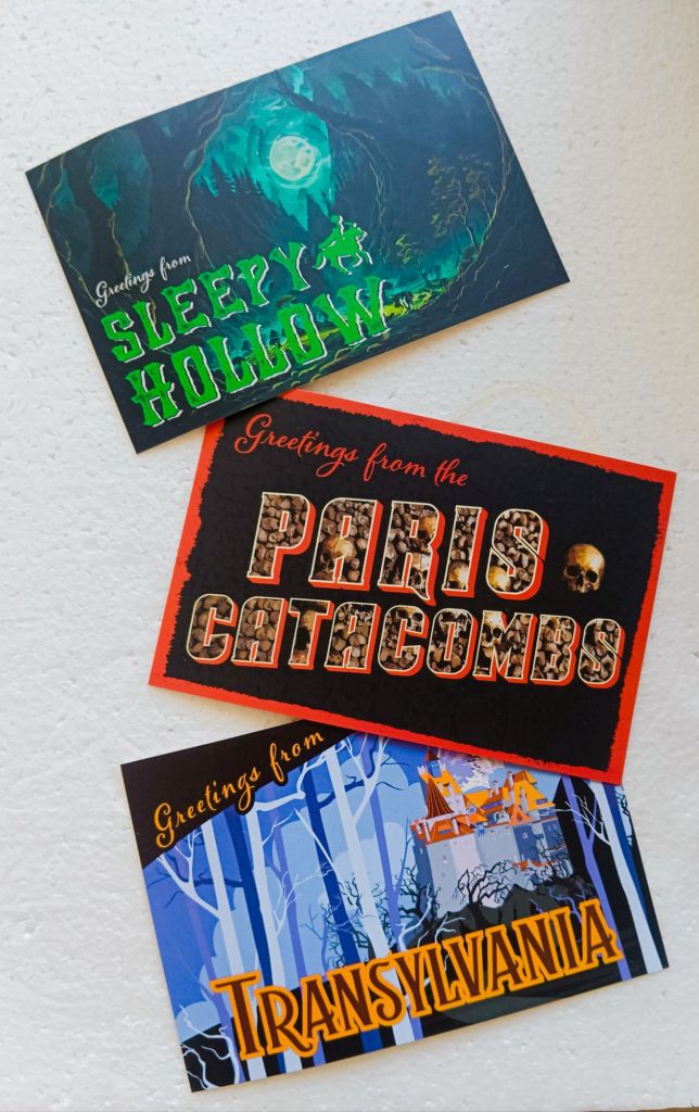 Last, but certainly not least, we have this set of three postcards. They read: ‘Greetings from Sleepy Hollow’, ‘Greetings from the Paris Catacombs’ and ‘Greetings from Transylvania.’ I love the vibrant colours. I immediately stuck them in my scrapbook.