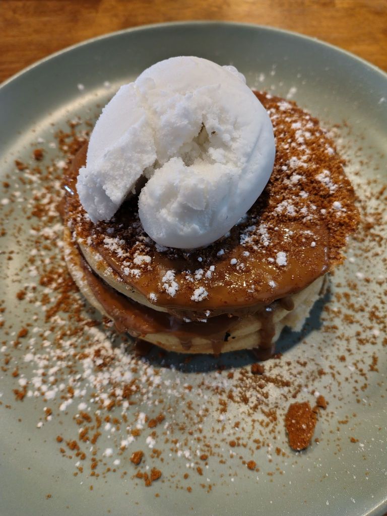 Warm aummer mornings make me think of going out for breakfast. I ate these absolutely delicious vegan Biscoff pancakes at a new cafe near the beach called ‘Eat in the Bay.’
