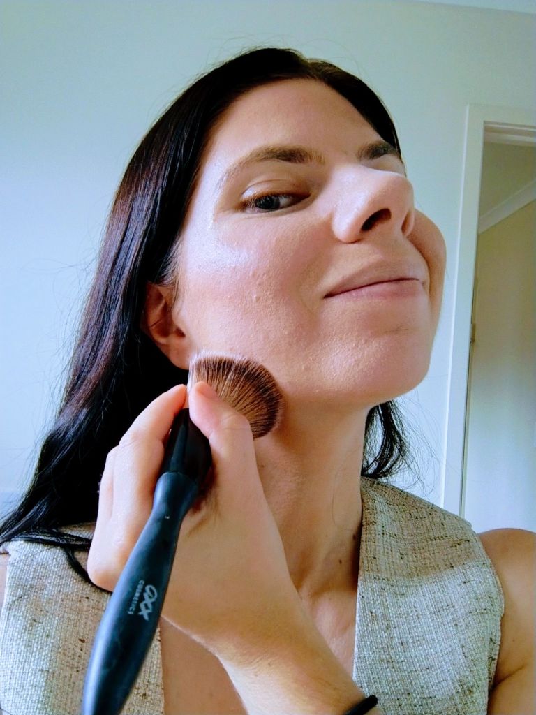 I put a couple of drops on top of my forehead, a dot just below my cheekbones and on the angles of my jaw. I then use a makeup brush to buff them out. The bronzing drops give my face a nice tint but don’t make me look orange.
