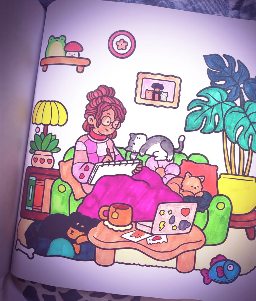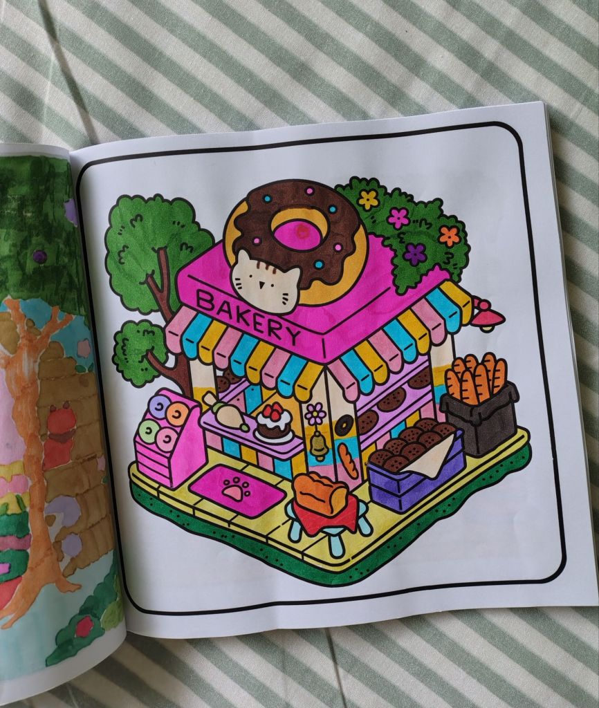 Today I am discussing my latest hyperfixation: adult colouring books. This craze has been sweeping the internet for some time now and it finally got ahold of me. The colouring books in question are from the Coco Wyo brand. They sell bright, cartoonish cosy editions, with bold graphics to make staying within the lines easier. All of their images are hand-drawn with love by a team of creative artists. They believe the art of colouring can heal and bring comfort. I can certainly attest to that! As somebody who struggles with coordination (read more here), I find this particular hobby very soothing. Even my daughter has become obsessed, having already completed multiple books. Without further ado, let’s get into it!